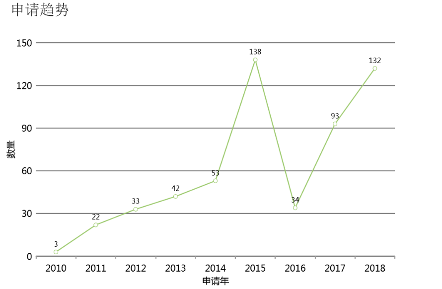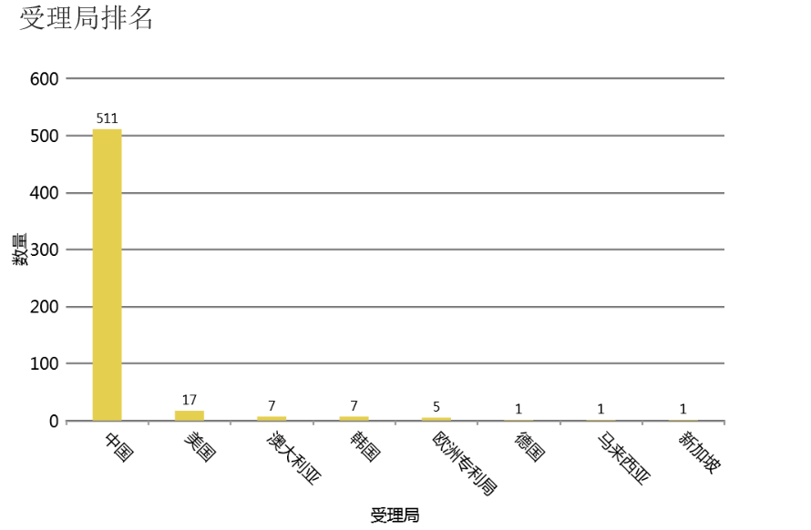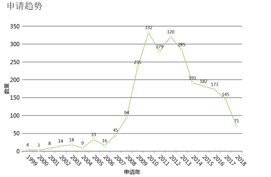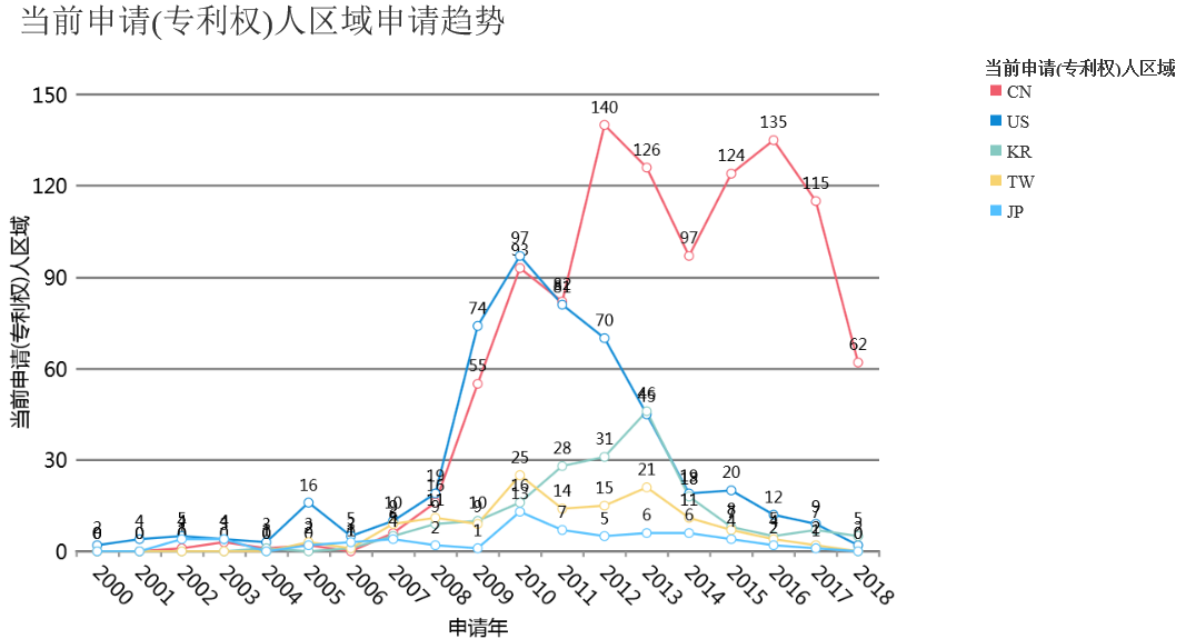 如图3所示,美国专利申请趋势与全球申请趋势基本一致;韩国申请量在2007-2013年处于增长阶段,随后便进入快速下降阶段;中国台湾地区申请量在2006-2010年处于增长阶段,2013年之后处于下降阶段;近八年日本专利申请量一直处于低位徘徊阶段;中国申请量从2008-2011年处于快速增长阶段,2012-2017年申请量处于高位波动状态。