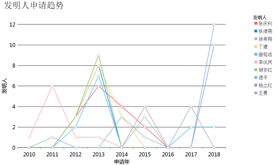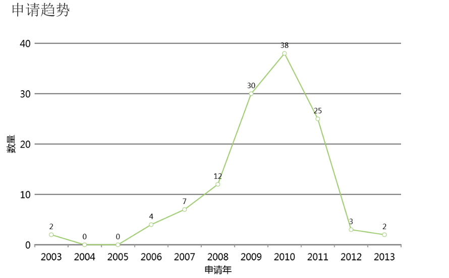 如图8所示,杜邦公司2009年申请量达到顶峰,随后处于快速下降阶段,2014年之后基本没有相关专利申请;无锡铜春新能源公司2013年申请量达到顶峰,随后快速下降,2015年之后处于低位小幅波动状态;北京铂阳顶荣公司近三年申请量处于小幅增长状态;其余各申请人的申请量高峰基本上位于2009-2014年,2014年之后申请量急剧减少。