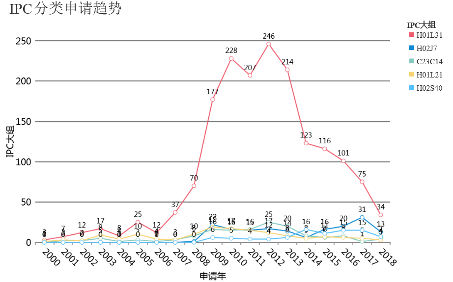 如图5所示,H01L31(太阳能产品、零部件和制作产品、零部件的方法和设备)的申请趋势与全球CIGS太阳能薄膜专利申请趋势基本一致,从2009年开始,其余各技术分支处于小幅度波动状态。