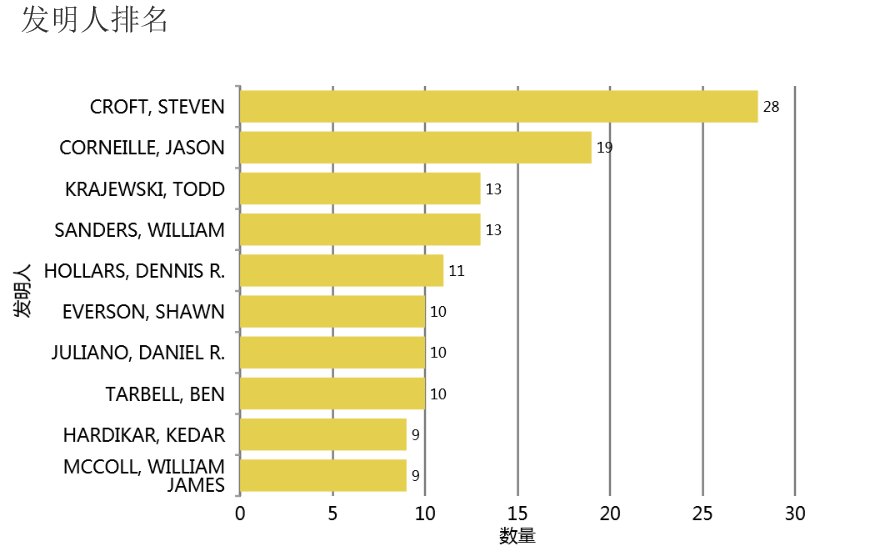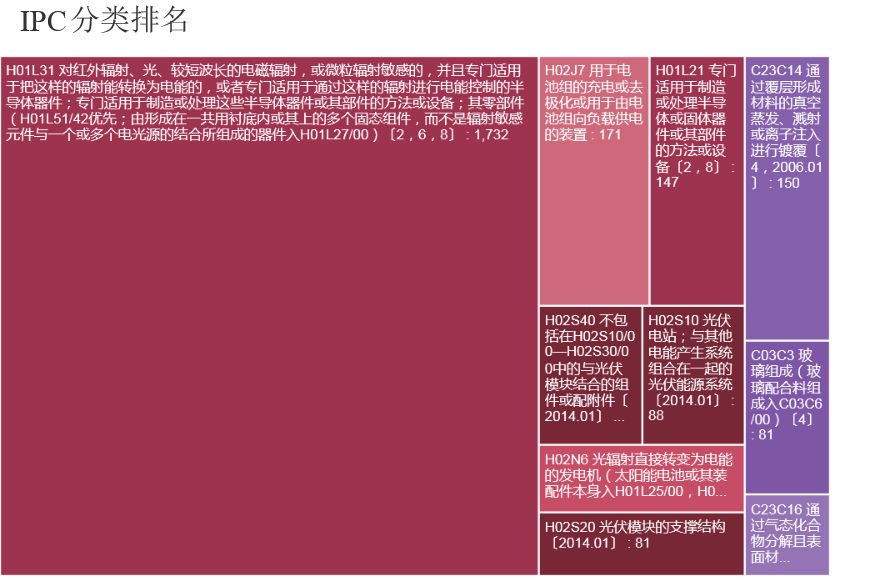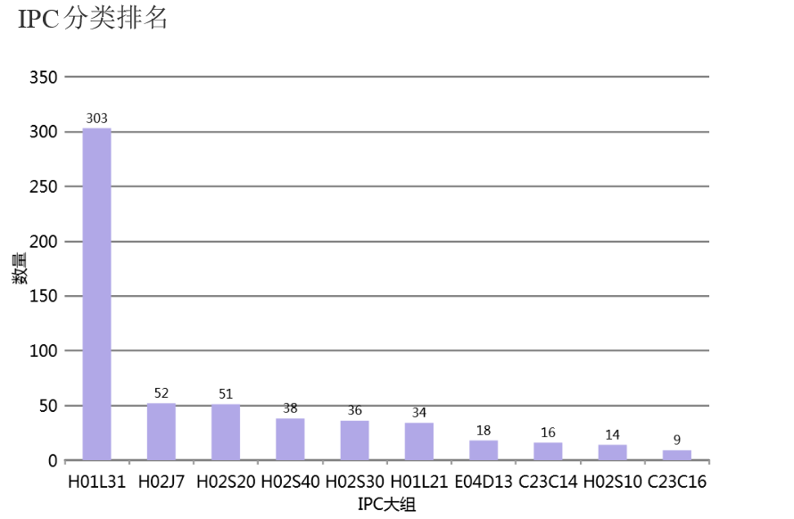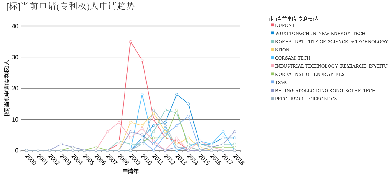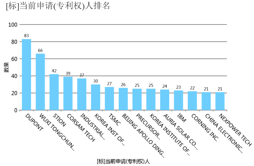 如图7所示,当前的发明专利申请人排名第一的为杜邦公司、其次是无锡铜春新能源公司、思阳公司、考斯曼公司;北京铂阳顶荣和中国电子工业集团分别位于第8和第14位。