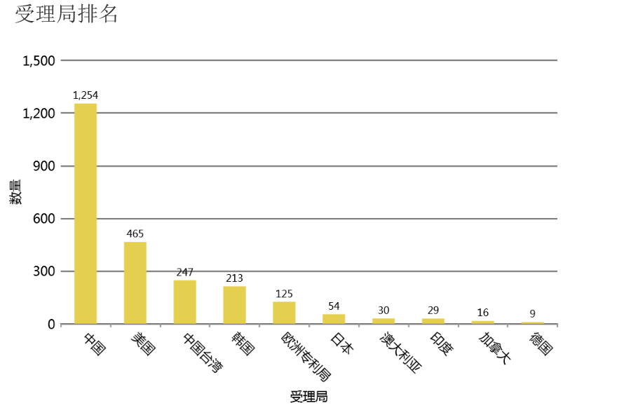如图2所示,中国专利申请量位于全球第一,其次是美国、中国台湾地区、韩国和欧洲区域。全球申请量前5位的国家与地区同后五位的申请量差距极大。