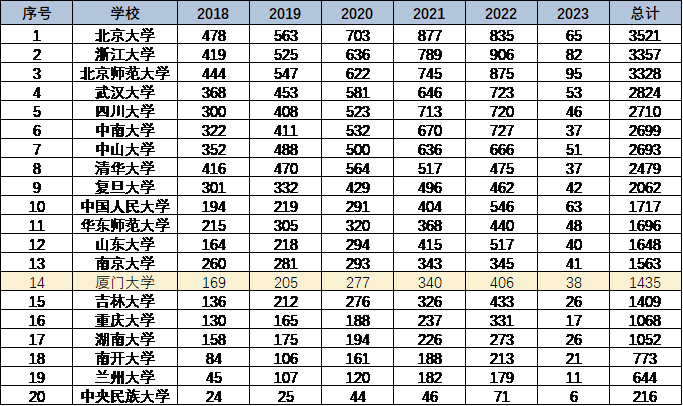 表1展示了从2018年至2023年7月,以选取的各所高校为第一署名单位发表的SSCI论文数量。其中,北京大学、浙江大学、北京师范大学分别以累计发文量3521篇、3357篇、3328篇排在前三位,厦门大学累计发表论文1435篇,排在第14位。图1:以厦门大学为第一署名单位的SSCI发文量