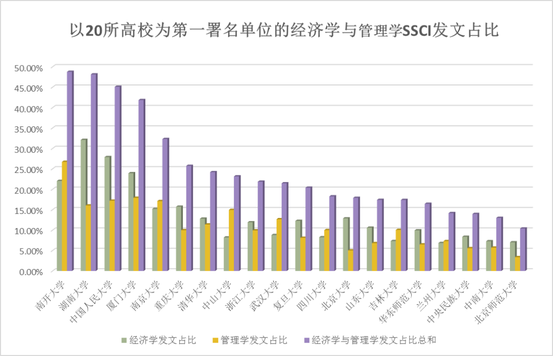 图3:以20所高校为第一署名单位的经济学与管理学SSCI发文占比图3展示了从2018年至2023年7月,以各所高校为第一署名单位发表的经济学与管理学学科的SSCI论文占比。除厦门大学外,南开大学、湖南大学和中国人民大学的经济学与管理学学科发文占比总和均超过40%。