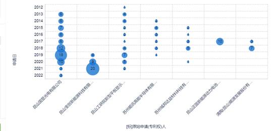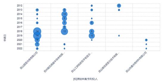 如图2.2所示,昆山市石墨烯专利申请人主要有昆山国显光电、昆山宝创新能源、昆山工研院、苏州迅能和苏州城邦达益新材料,其余申请人申请量较少。其中昆山国显光电和昆山宝创新能源申请量集中在近5年,如图2.3所示。