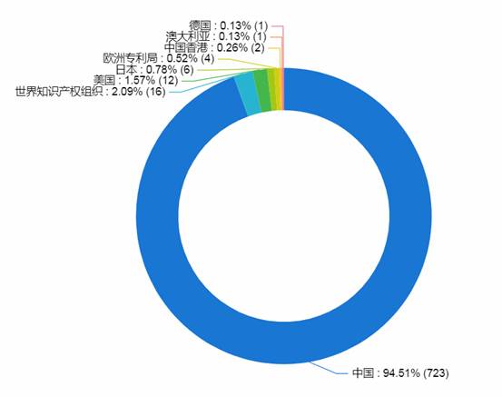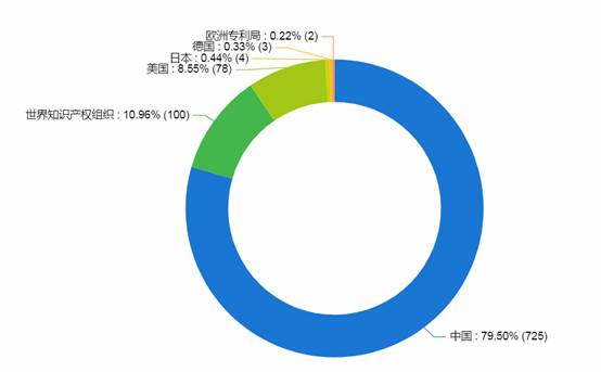 如图2.11所示,常州市石墨烯专利在海外主要布局在欧洲、美国和日本,专利布局量较少。