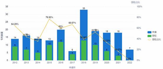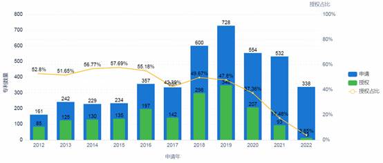 如图1.1所示,近10年来,昆山市第三代半导体发明专利申请量处于小幅波动状态,专利授权率超过50%。