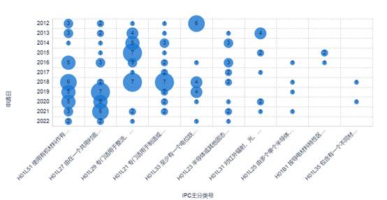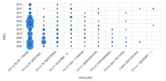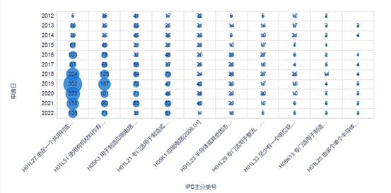 如图1.4所示,昆山市第三代半导体发明专利所涉及的技术领域主要包括H01L51、H01L27、H01L29、H01L21、H01L33、H01L23和H01L31,其中H01L51、H01L27和H01L33三个技术领域申请量主要集中在近5年,H01L29技术领域申请量主要集中在2013-2018年,H01L21技术领域申请量较为平均的分布在近10年,其余各技术领域申请量属于点状分布。所涉及的应用领域主要包括了有机发光半导体器件(如显示器件和光伏电池)及其制备(H01L51);集成电路结构制造(H01L27、H01L29和H01L23),如晶体管、二极管;半导体部件的制造装置(H01L21);LED元器件(H01L33);光伏电池(H01L31)。