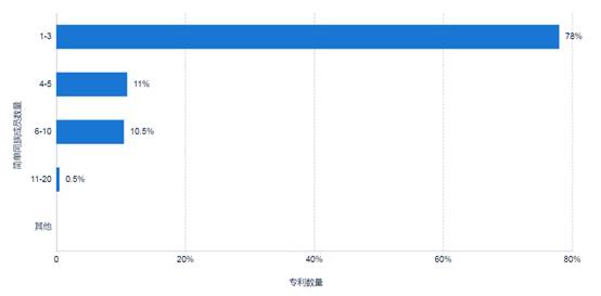 基于权利要求数、独立权利要求数、被引次数和简单同族数评估昆山市石墨烯专利质量,如图2.6-2.9所示。从权利要求数分布来看,约10%的专利权利要求数超过10个;从独立权利要求数分布来看,约15%的专利独立权利要求数超过3个;从被引次数分布来看,约8%的专利被引次数超过6次;从简单同族专利数量分布来看,5%的专利同族数超过3个。