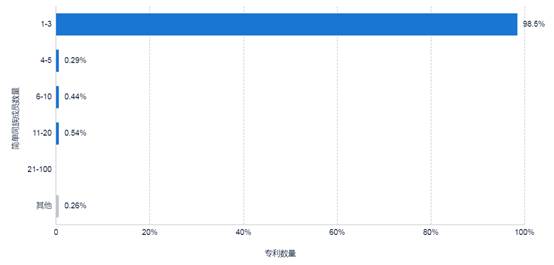 基于权利要求数、独立权利要求数、被引次数和简单同族数评估常州市石墨烯专利质量,如图2.12-2.15所示。从权利要求数分布来看,约8%的专利权利要求数超过10个;从独立权利要求数分布来看,约13%的专利独立权利要求数超过3个;从被引次数分布来看,约10%的专利被引次数超过6次;从简单同族专利数量分布来看,1.3%的专利同族数超过3个。