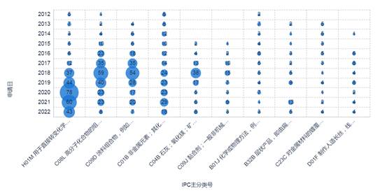 如图2.4所示,昆山市石墨烯发明专利所涉及的技术领域主要包括H01M、H01L、C08L、G06F、H05K、G09J和B32B,其中H01M、H01L和C08L三个技术领域申请量主要集中在近5年,其余各技术领域申请量较为平均的分布在近10年。所涉及的应用领域主要包括了电池(H01M)、半导体器件(H01L)、高分子化合物(C08L)、传感器(G06F)、电磁吸收与传热材料(H05K)和粘结剂(C09J)。