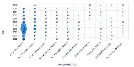 如图3.2所示,昆山市微电子专利申请人主要有昆山国显光电、昆山工研院、苏州迅能、华天科技和昆山龙腾,其余申请人申请量较少,其中昆山国显光电申请量远超过其他申请人,申请时间在近5年呈快速增长趋势,其余申请人申请量在各年份呈平均分布状态,如图3.3所示。