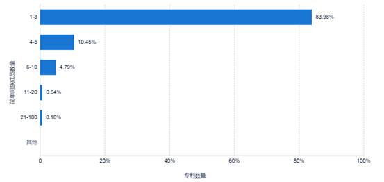 基于权利要求数、独立权利要求数、被引次数和简单同族数评估厦门市第三代半导体专利质量,如图1.12-1.15所示。从权利要求数分布来看,约33%的专利权利要求数超过10个;从独立权利要求数分布来看,约20%的专利独立权利要求数超过3个;从被引次数分布来看,约11%的专利被引次数超过6次;从简单同族专利数量分布来看,16%的专利同族数超过3个。