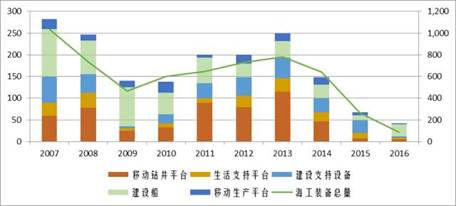 2016年,全球新签各类海工装备88艘/座,同比下降94.3%,在2015年深度萎缩的基础上再次下探。除海工建设类船成交数量小幅上涨外,其他各类型海工装备均有不同幅度下滑[6]。全年钻井平台利用率下降至64%、钻井平台平均日租金水平降幅超过30%、海工辅助船和钻井平台闲置和封存数量上升至2008年以来最高位。总之,无论从哪项数据来看,全球海工装备市场都不得不直视其惨淡增势的事实。在此背景下,海工船东的存续经营将面临严峻挑战,船东债务重组及破产保护事件频发。