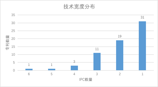 专利的技术宽度表示该专利所保护的技术方案所涉及的技术领域,通常用IPC数量表示,技术宽度越宽 ,表明该专利技术方案保护范围越广,保护难度越大,专利质量越高。实验室66件专利中,技术宽度平均1.88个,IPC数量4个以上的专利有5件,近一半专利的IPC数量为1个。本报告中技术宽度的IPC计数为IPC小组技术,未采用通常表示技术领域的IPC小类计数。(见图2.1)上述信息表明,实验室专利整体技术宽度较窄,专利较少涉及跨领域的技术方案。