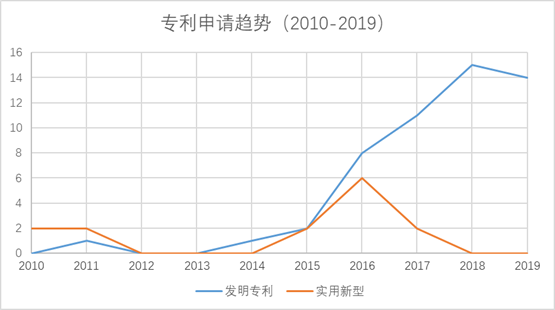 经检索并筛选共得到专利66件,其中发明专利52件(发明授权15件,撤回两件),实用新型14件。2015年-2018年发明申请量呈快速增长趋势,实用新型申请量在2016年之后,快速减少,2018和2019年实用新型申请量为0。在学校取消发明申请费用补贴的情况下,发明申请量增加,实用新型申请量减少,这表明发明人的研发实力在不断提高,且更注重高质量发明专利的申请。(见图1.1)
