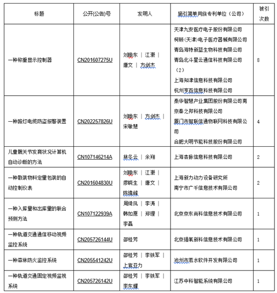 如表7-2所示,有8件专利被公司引用,其中6件实用新型,2件发明。“一种称重显示控制器CN201607275U”和“一种路灯电缆防盗报警装置CN202257826U”两件实用新型被公司引用次数最多,分别为8次和4次,这些公司可能成为潜在的技术转移转化对象,如青岛北斗星云通信科技有限公司、厦门市智联信通物联网科技有限公司。但未有公司对实验室某一应用领域的专利进行持续性跟踪、引用,因此不具有较明显的技术转移转化对象。