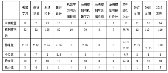 实验室66件专利,共有权利要求414项,平均6.27项/件。如表2-2所示,从中位数和标准差分析可得,从学科范畴来看,机器学习领域的权利要求数分布最平均,系统控制与机器学习领域的权利要求数量两级分化最大;从申请趋势来看,近三年来,专利的权利要求平均数量和中位数逐渐增加、数量分布越来越平均,这表明实验室科研人员的专利交底材料撰写能力和对申请质量重视程度在不断提高;发明授权的权利要求平均值、中位数和标准差与整体并无明显差别,这表明发明申请以授权为直接目的,重点专利不突出,缺少以基础专利-核心专利-外围专利为组合的层次布局。