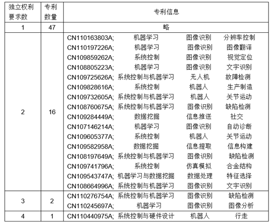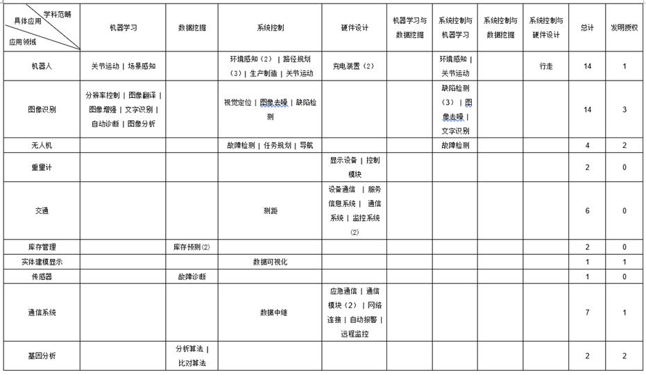 从专利技术研发体系,系统控制、硬件设计、机器学习和系统控制与机器学习等4个学科范畴的专利申请量最多;机器人和图像识别两个应用领域涉及的申请量最多,并以发明专利为主,通信系统和交通领域其次,以实用新型为主。