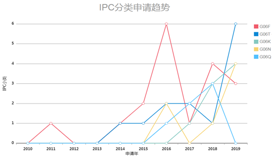 实验室专利主要集中在G06(计算,推算,计数)IPC大类技术领域,从IPC小类来看,G06T(一般的图像数据处理或产生)的申请量自2013年以来呈缓慢增加趋势,2019年申请量快速增加;G06F(电数字数据处理)申请量近5年有所波动;G06K(数据识别;数据表示;记录载体;记录载体的处理)和G06N(基于特定计算模型的计算机系统)的申请量近三年处于增长趋势,G06Q(专门适用于行政、商业、金融、管理、监督或预测目的的数据处理系统或方法)目前仅在2016-2018年有申请。(见图1.4)