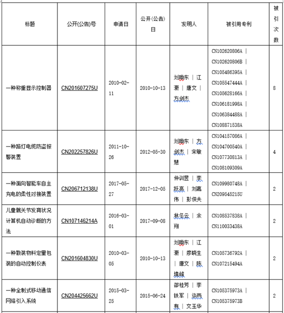 如表2-1所示,66件专利中,有12件专利共被引用26次,平均被他引次数0.38次,最高被引次数8次。12件专利中,有8件为实用新型,其中