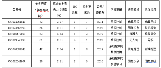 如表7-1所示,6件专利所属的学科主要为系统控制,分别涉及仿真、图像识别、机器人、无人机和信息推送等应用领域。6件专利的专利强度不高,IPC数量和权利要求数均未超过平均水平,未有被引用的情况,5件发明授权,1件实审,其中授权专利中CN102436184B专利寿命已达到6年,超过一个缴费周期,其余4件专利均为近两年授权。